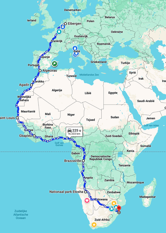 Vanuit Eibergen rijden we naar Spanje waar we de oversteek naar Afrika gaan maken. Vanaf hier ligt de route los-vast. Aanpassingen maken we aan de hand van de condities van de weg, het weer, spanningen in het land of plekken die we graag willen bezoeken.